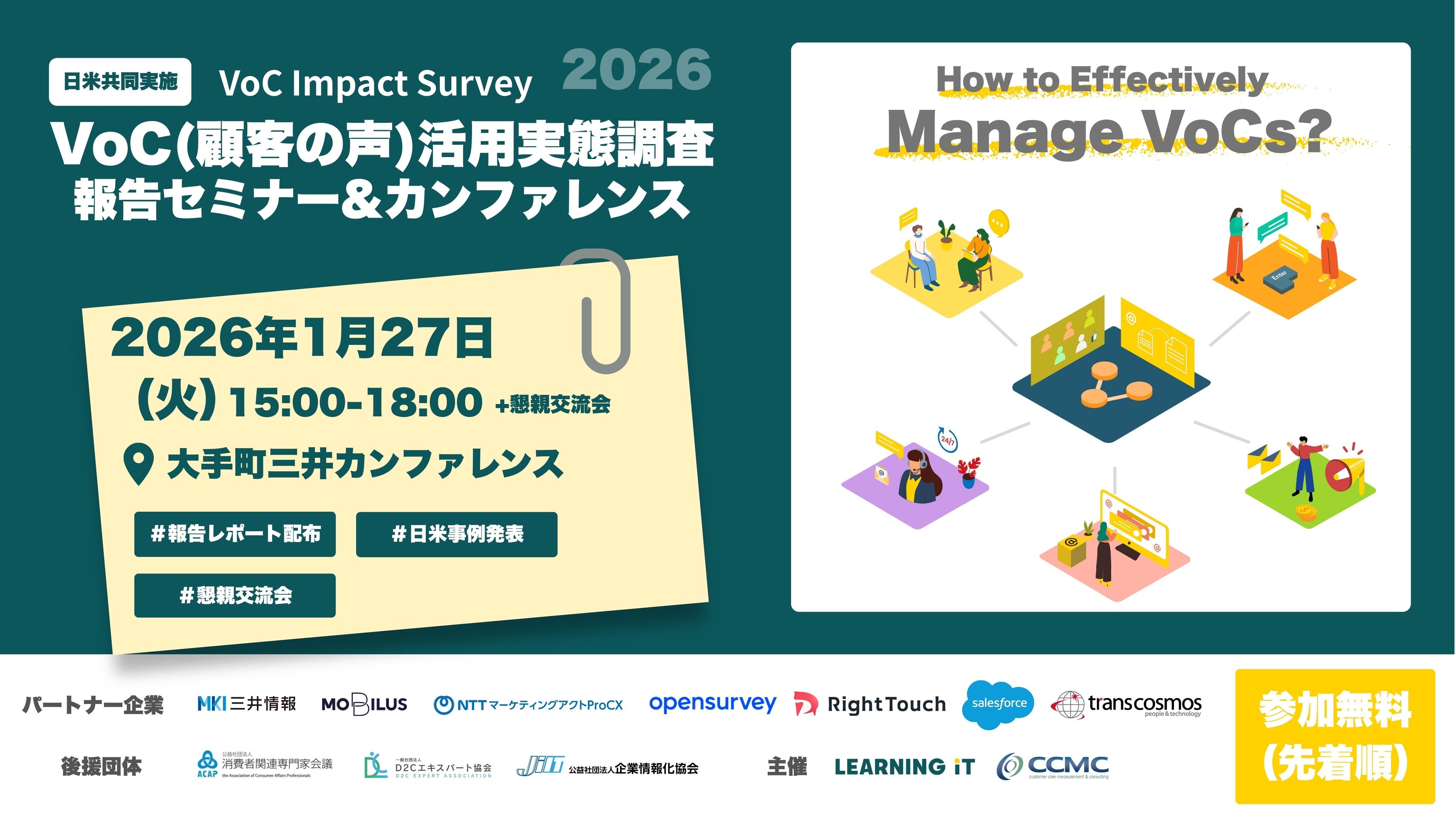 コンタクトセンター向けCXソリューションを開発・提供するモビルス株式会社(本社:東京都品川区、代表取締役社長:石井智宏、以下:モビルス)は、株式会社ラーニングイット(本社:神奈川県横浜市、代表取締役:畑中伸介、以下:ラーニングイット)が主催する「VoC(顧客の声)調査報告セミナー&カンファレンス」にて、VoCエコシステム・パートナーとして代表 石井智宏がパネルディスカッション「VoC実態調査から見えた課題と展望」に登壇することをお知らせします。本カンファレンスは、2026年1月27日(火)に大手町三井カンファレンスにて開催されます。