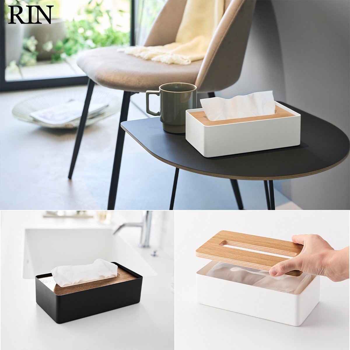 木とスチールの組み合わせが美しい、蓋付きのコンパクトティッシュケースです。