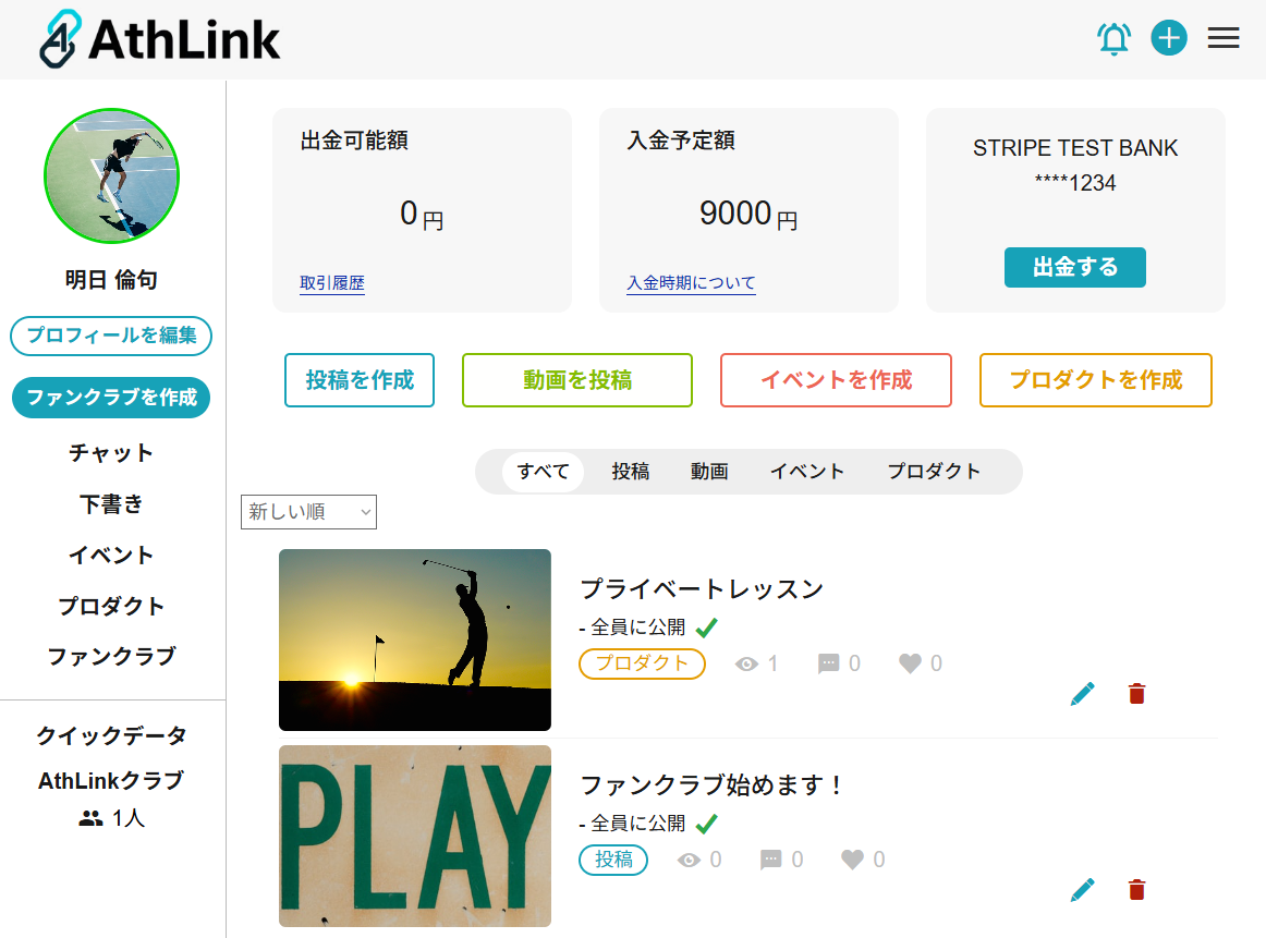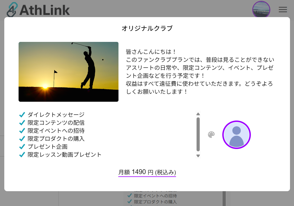 AthLink(アスリンク)は、アスリートとファン/スポンサーをつなぐ「スポーツ専用ファンクラブプラットフォーム」です。プロアスリートやプロチームはもちろん、競技に向き合っているアマチュアアスリートやチーム、部活動も登録できます。