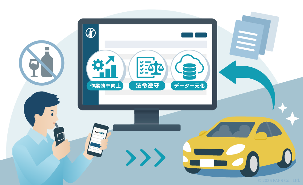 パイ・アールが提供する「アルキラーNEX」は、いつ・どこで・だれがアルコールチェックを行ったかをクラウド上で一元管理できるサービスとして、多くの白ナンバー事業者に導入されています。
