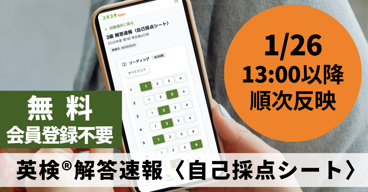 英検(R)対策Webアプリ「スタスタApps」(運営:スタディスタジオ株式会社)は、英検(R)2025年度第3回一次試験の解答速報に対応し、本会場および準会場D/E/F日程の解答速報(2026年1月26日(月)13:00以降に協会公式サイトへ掲載予定)について、掲載を確認後、解答速報〈自己採点シート〉へ順次反映します。