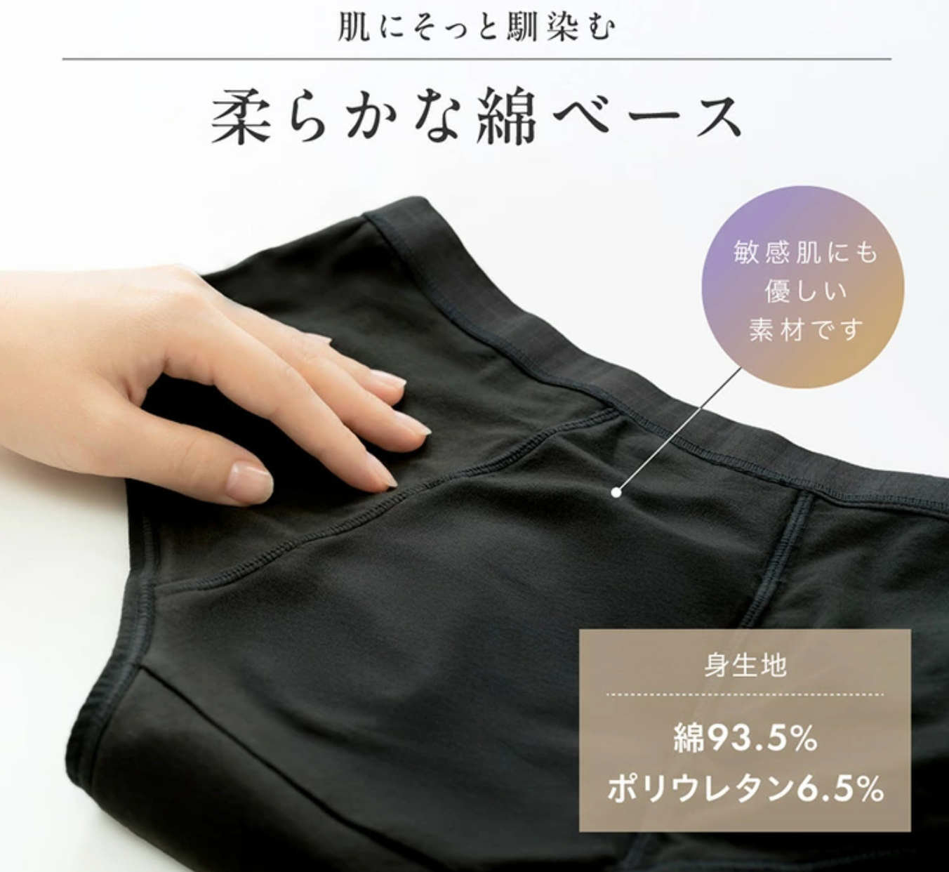 - 肌ストレスを抑える綿93.5%素材デリケートな時期の肌荒れや不快感を考慮し、綿混素材を採用。