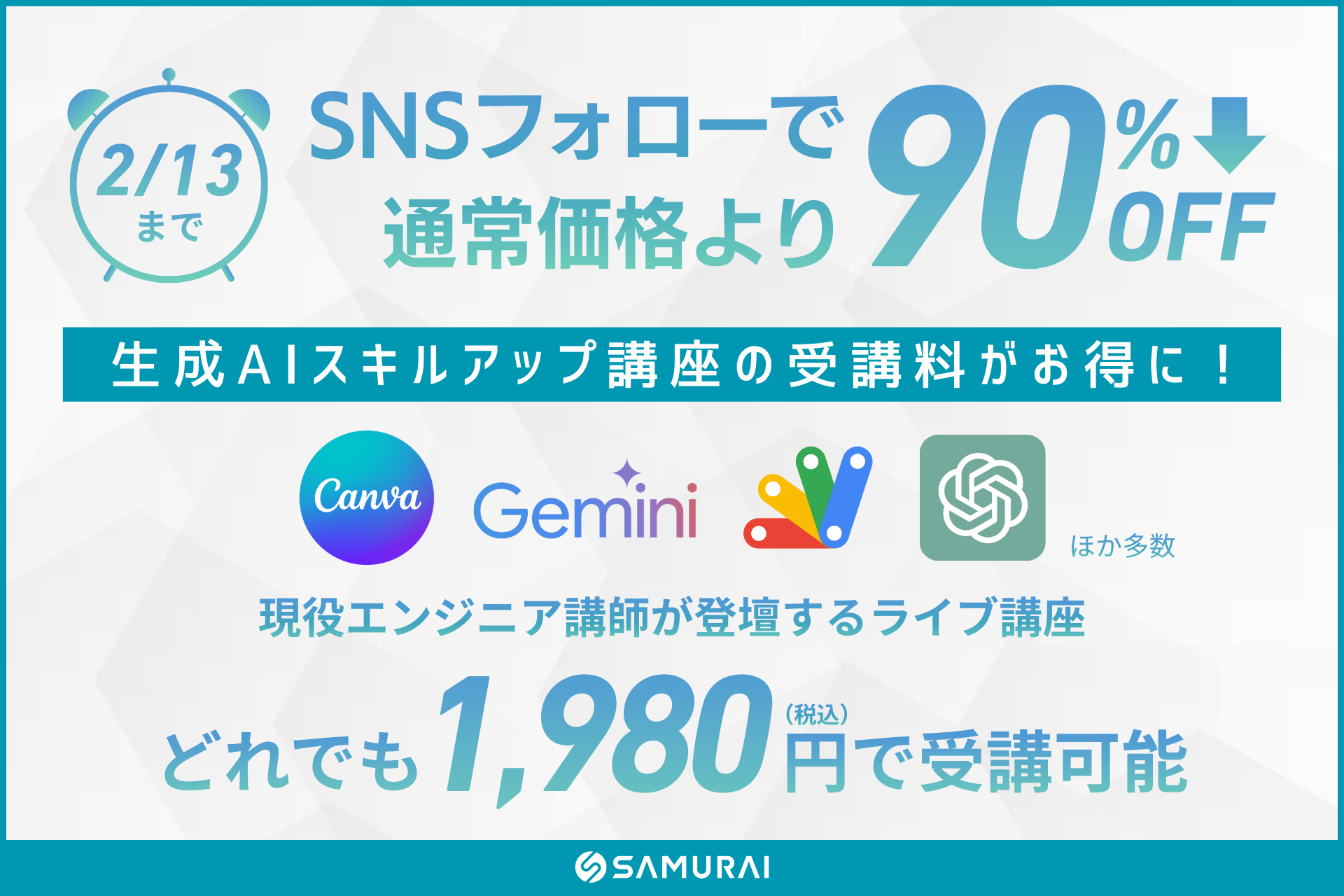 法人向けIT教育・研修事業を展開する株式会社SAMURAI(本社:東京都港区、代表取締役:羽田吾立)は、生成AIスキルの習得を目的とした公開講座において、年始の学習応援企画としてSNSキャンペーンを実施しています。本キャンペーンでは、通常価格から最大90%割引となる1,980円(税込)で講座を受講できます。