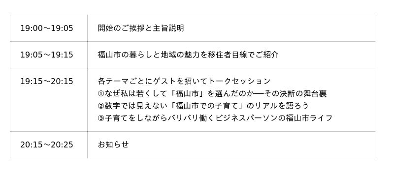 イベントでは、福山市に住む4名から市内の産業や市の制度などが紹介されたほか、ゲストによる実体験に基づいたトークセッションが展開されました。参加者からはチャットを通じて、具体的な仕事の探し方や生活コスト、地域コミュニティへの入り方など、多くの質問が寄せられました。【コンテンツ内容】