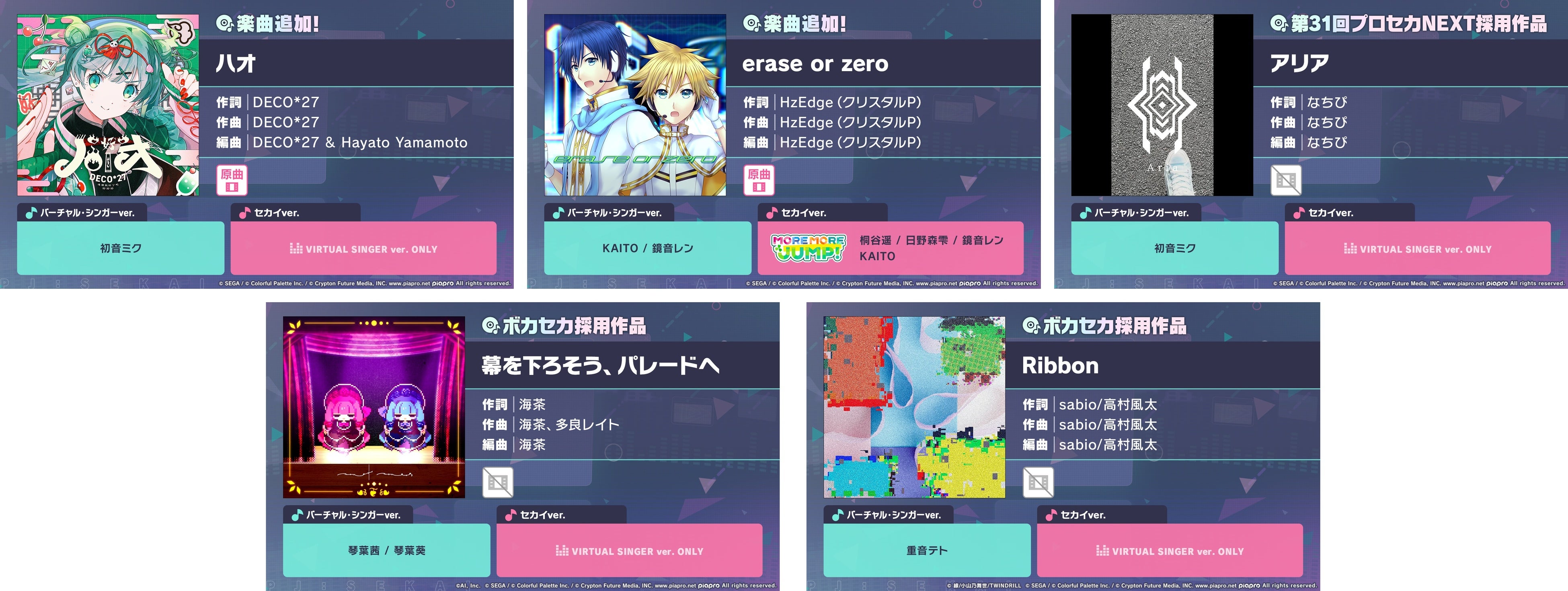 新たなリズムゲーム楽曲として、以下5曲の追加が決定いたしました。『アリア』は、「一緒に作ろう!第31回楽曲コンテストプロセカNEXT」の採用作品、『幕を下ろそう、パレードへ』は、「The VOCALOID Collection ~2025 Summer~」TOP100ランキング1位の作品、『Ribbon』は、「The VOCALOID Collection ~2025 Summer~」ルーキーランキング1位の作品となります。