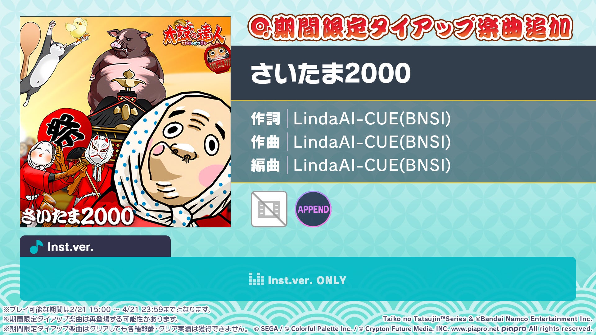 和太鼓リズムゲーム『太鼓の達人』とのタイアップ楽曲3曲が、新たなリズムゲーム楽曲として2月21日(土)より順次登場することが決定いたしました。タイアップ楽曲はすべて、特別なSEやボイスがつく「太鼓の達人モード」でプレイすることができます。