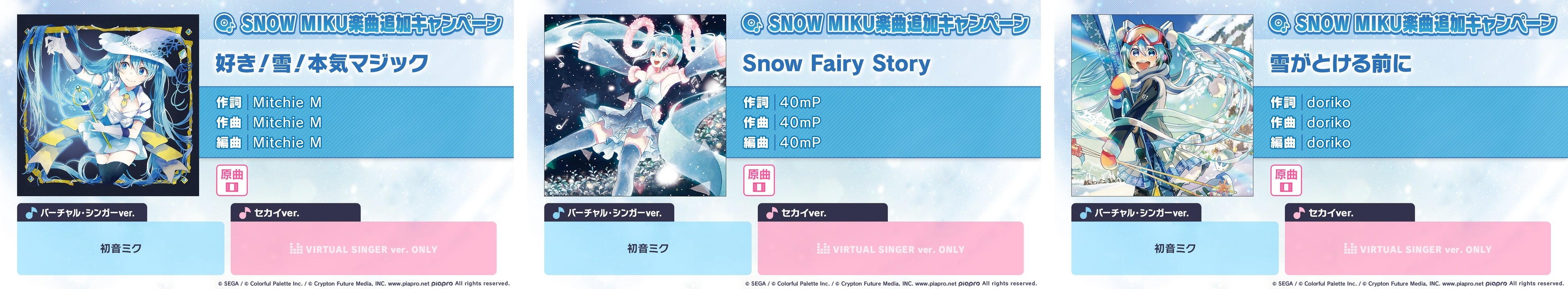 「SNOW MIKU」のテーマソングを一挙追加する「SNOW MIKU 楽曲追加キャンペーン」の開催が決定いたしました。新たなリズムゲーム楽曲として、以下9曲を追加いたします。