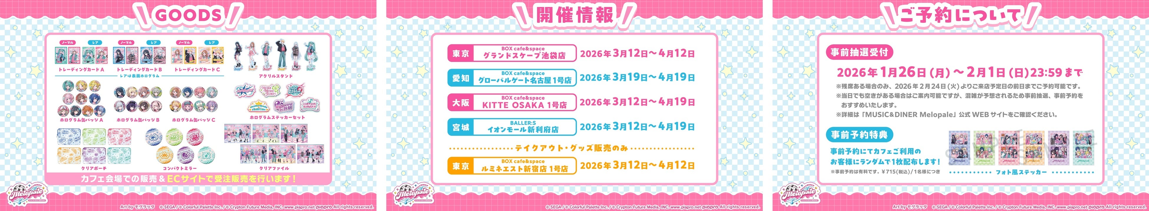 カフェのご利用につきましては、現在「MUSIC&DINER Melopale」のWEBサイト( https://music-diner-melopale.theme-cafe.jp/ )にて事前抽選を受け付け中です。事前予約特典として「フォト風ステッカー」もご用意しておりますので、ぜひチェックしてみてください。