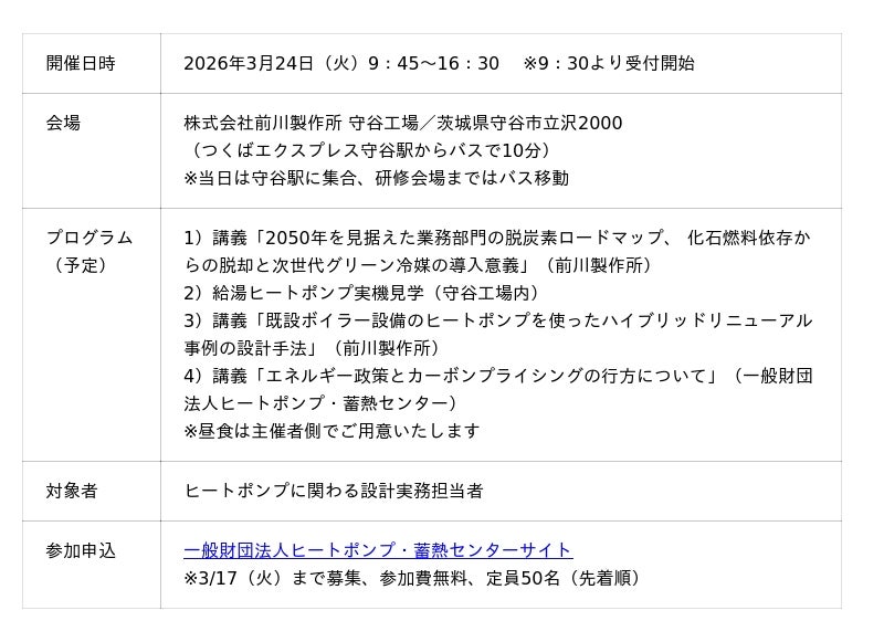 [表: https://prtimes.jp/data/corp/163164/table/56_1_26f409993661bc4d38cd664562ef77a9.jpg?v=202601270245 ]給湯リニューアルセミナー(給湯ヒートポンプ実機見学付き)案内リーフレット
