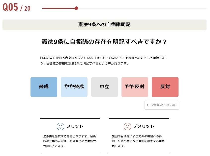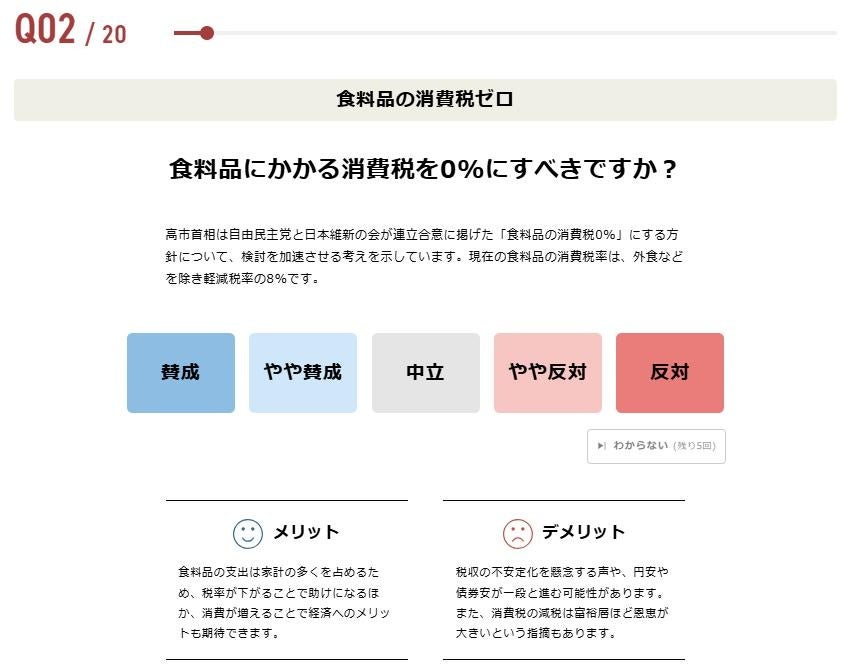 今回は20問の質問をご用意しました。選挙ドットコム設問を設計し、政党要件を満たす国政政党へのアンケートを行い、その回答を基に制作しています。今回の衆院選の「争点」として挙げられている消費税減税、外国人政策、安全保障など幅広い分野の設問になりますが、全ての質問に概要を説明する「解説文」と「メリット」「デメリット」を記載することで、利用者の判断材料をご提供します。