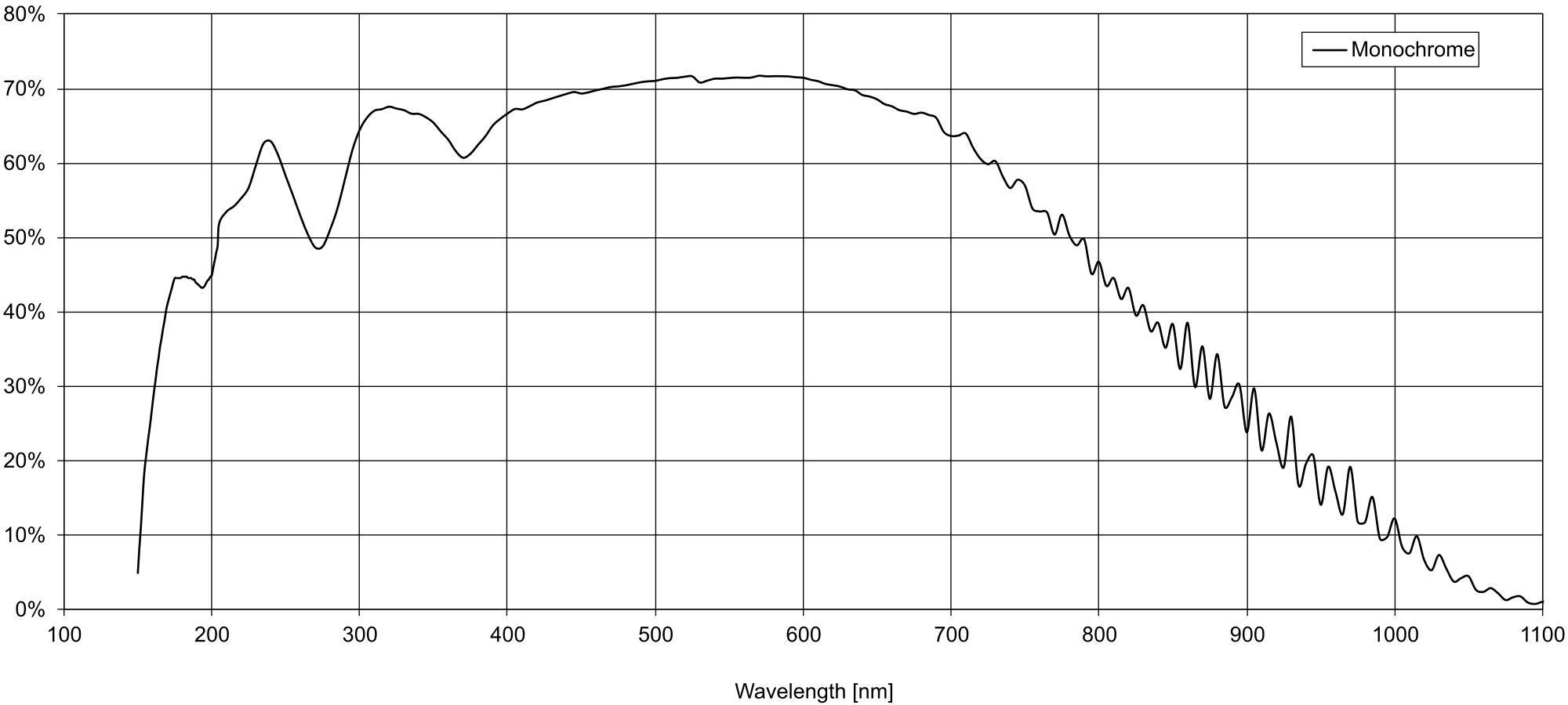 PhotonfocusのUVカメラは、汎用イメージセンサをベースとした製品ではありません。深紫外の光子をシリコン表面で効率よく検出することを目的に設計された、独自のUV専用センサを採用しています。このセンサは下記のような特徴を持ち、200nm以下の波長を直接検出可能としています。