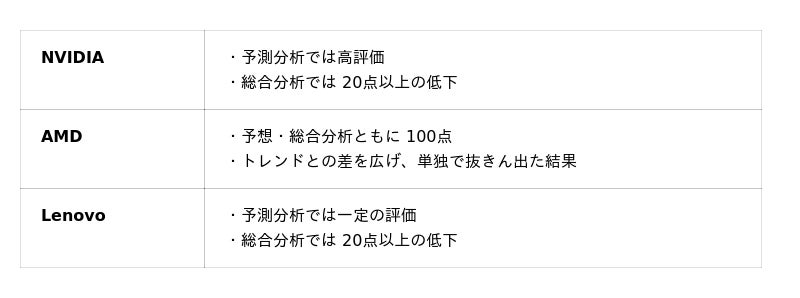 ■ 予測分析と総合分析の差が浮き彫りにした、NVIDIA/AMD/Lenovoのスコア変化