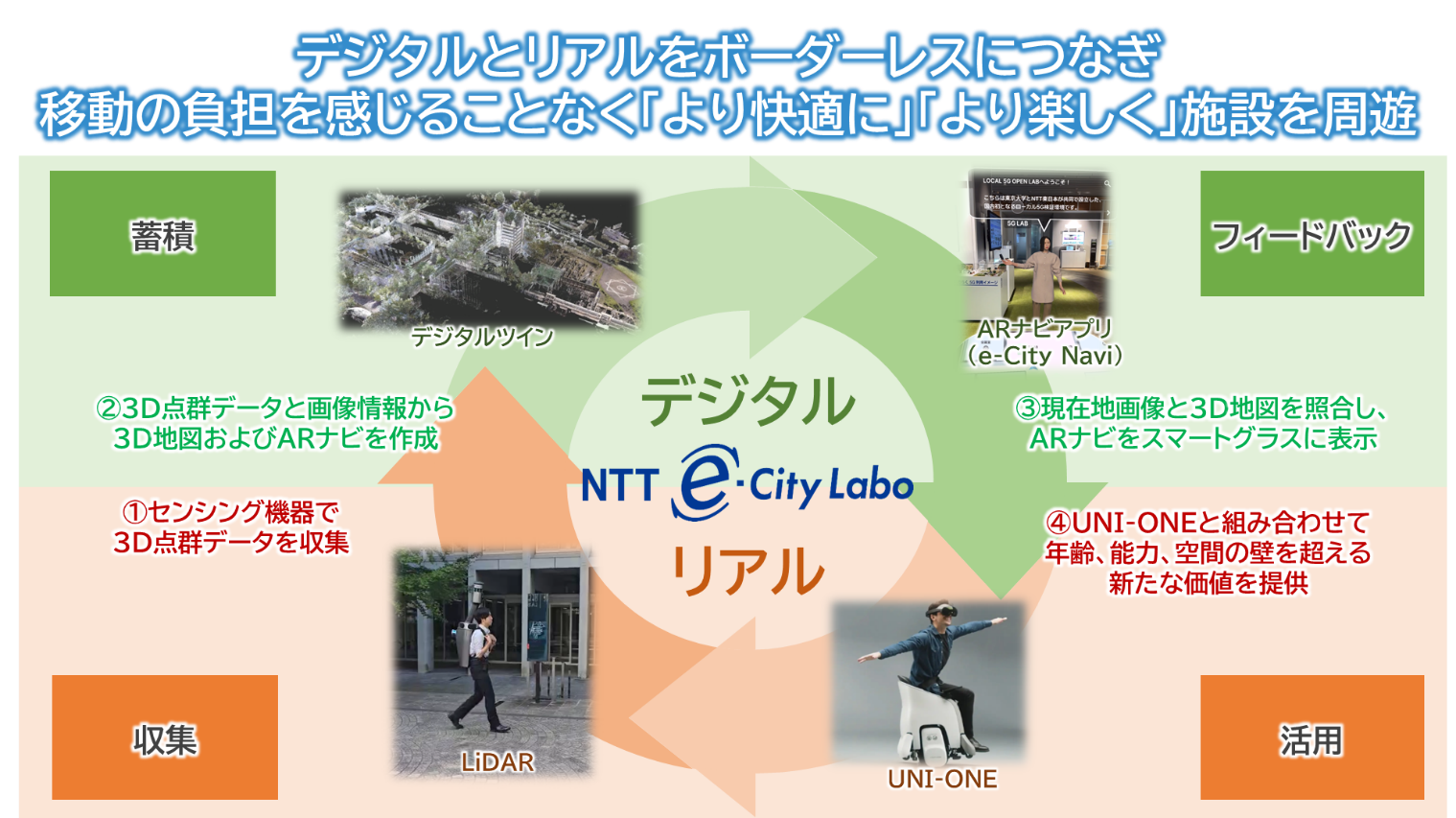 本実証では、LiDAR※1による3D点群データと画像情報をもとに構築したデジタルツインと、ARナビゲーションアプリ「e-City Navi」を組み合わせ、NTTe-City Labo来場者さまの施設周遊支援を行います。ARグラスを装着することで、施設内の案内ナビゲーションに加え、NTTe-City Laboの実証環境および展示ソリューションの解説や社会実装イメージをARコンテンツとして視覚的・直感的に体験でき、リアルとバーチャルが融合した新たな施設周遊体験をお楽しみいただけます。また、ARグラスを活用することで両手が解放され、コンテンツを楽しむ際の「歩きスマホ」やモビリティ乗車中の「ながらスマホ」を抑制することが可能となります。これにより、利用者の安全性向上が期待されます。