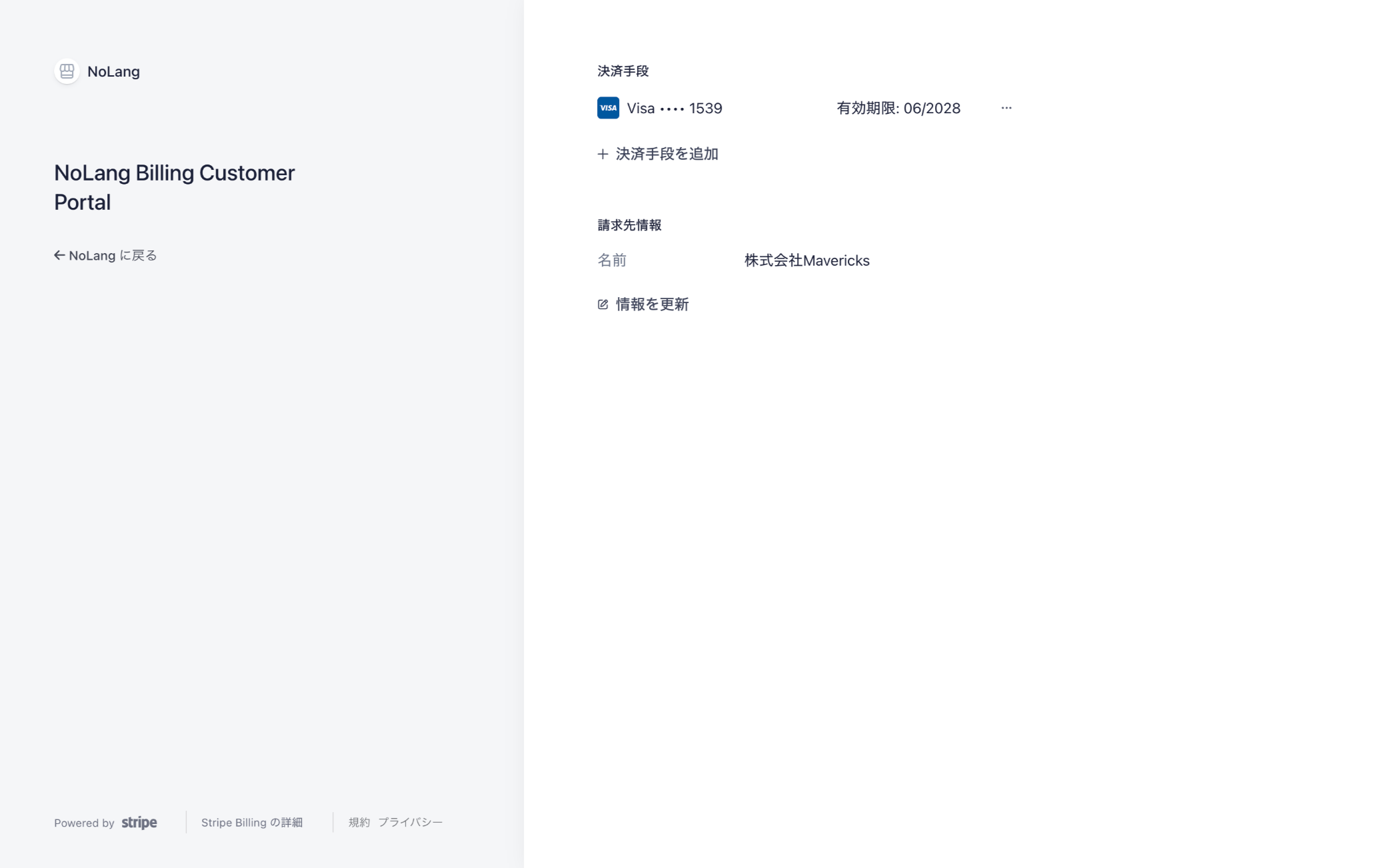 NoLangにログイン後、「マイページ」内の「プラン情報」タブを開きます。画面右下にある「支払い情報更新」ボタンをクリックしてください。