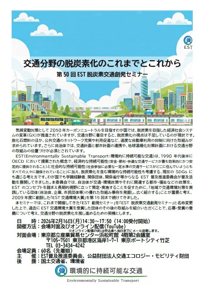 EST普及推進委員会(委員長:加藤 博和/名古屋大学教授)及び公益財団法人交通エコロジー・モビリティ財団(東京都文京区、会長:田端 浩、略称:エコモ財団)は、「交通分野の脱炭素化のこれまでとこれから」をテーマにした「第50回EST脱炭素交通創発セミナー」をハイブリッド開催する運びとなりました。記念すべき50回目となる本セミナーでは、過去の「EST交通環境大賞」受賞団体のその後の取組みを振り返り、環境的に持続可能な交通(EST)と交通分野における脱炭素化の社会実装推進に向けた新たな一歩を進める契機を提供いたします。
