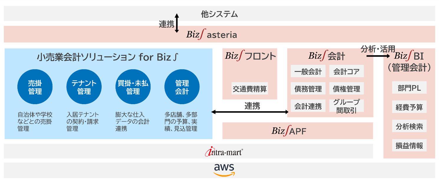 「小売業会計ソリューション for Biz∫」は、株式会社NTTデータ・ビズインテグラル(以下:NTTデータ・ビズインテグラル)が提供するERPパッケージソフトウェア「Biz∫」を中核として構築した、小売業向けソリューションです。