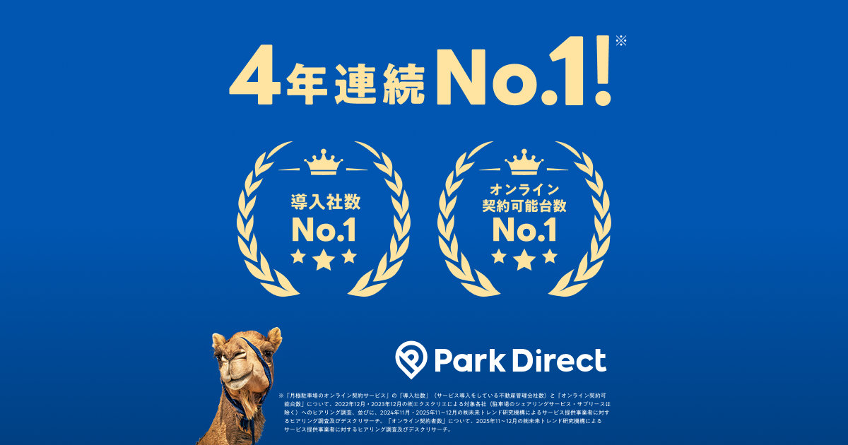 パークダイレクトは2019年より、月極駐車場の募集、申込、契約、支払、賃料保証、更新/解約といった一連の業務を一気通貫してオンライン上で完結できるシステムとサービスを構築してまいりました。その結果、不動産管理会社様、オーナー様、駐車場ユーザーの皆様にご評価いただき、2025年に「導入社数」「オンライン契約可能台数」「オンライン契約者数」でNo.1(※1)となりました。「導入社数」と「オンライン契約可能台数」については2022年の調査開始以来、4年連続(※1)の獲得となります。
