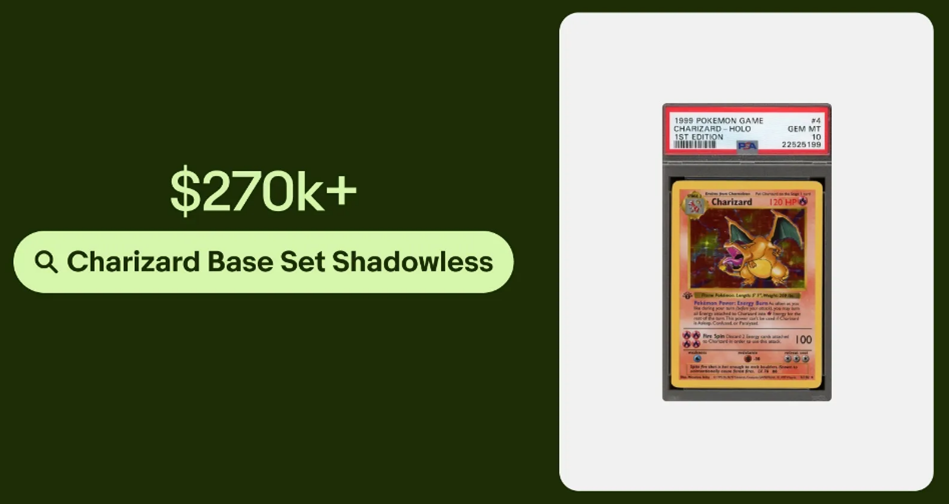 エンスージアストが多く集まるeBayでは、「どうしても欲しい」という熱量が集まり、コレクターズアイテムに驚くほど高い価値がつくことがあります。今年eBayで販売されたトレーディングカードゲーム(TCG)シングルの中で最高額となったのは、「Charizard Base Set Shadowless 1st Edition Holo Rare #4 PSA 10」は、27万ドル(約4,265万円※1)超で落札されました。このカードは、1999年に発売された「ポケモンカードゲーム」初代ベースセット版のリザードンで、初期の印刷仕様である「Shadowless(シャドウレス)」、「1st Edition」の刻印、ホログラム加工といった要素が重なり、エンスージアストの強い需要を集めやすい一枚となっています。