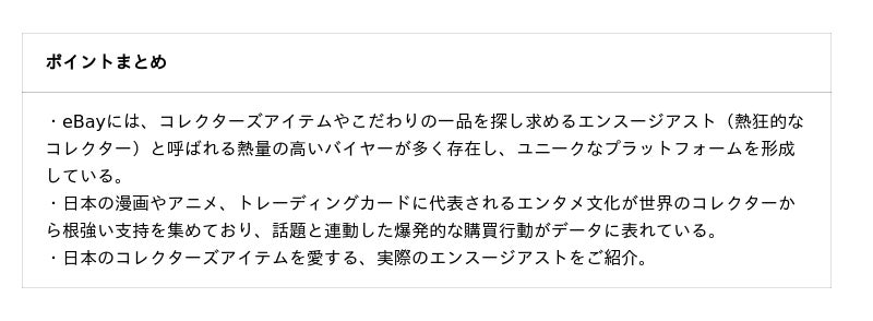 世界最大規模のオンライン・マーケットプレイス「eBay(イーベイ)」への出店を通じ、16年以上日本セラーの越境EC(海外販売)を支援するイーベイ・ジャパン株式会社(所在地︓東京都渋谷区、代表取締役社長︓岡田 雅之、以下イーベイ・ジャパン)は、2025年における全世界のコレクティブルアイテムの販売動向やトレンドをまとめた「2025 in Collecting Trends」を発表しました。調査の詳細は「2025 in Collecting Trends」よりご覧いただけます。 https://pages.ebay.com/collected/