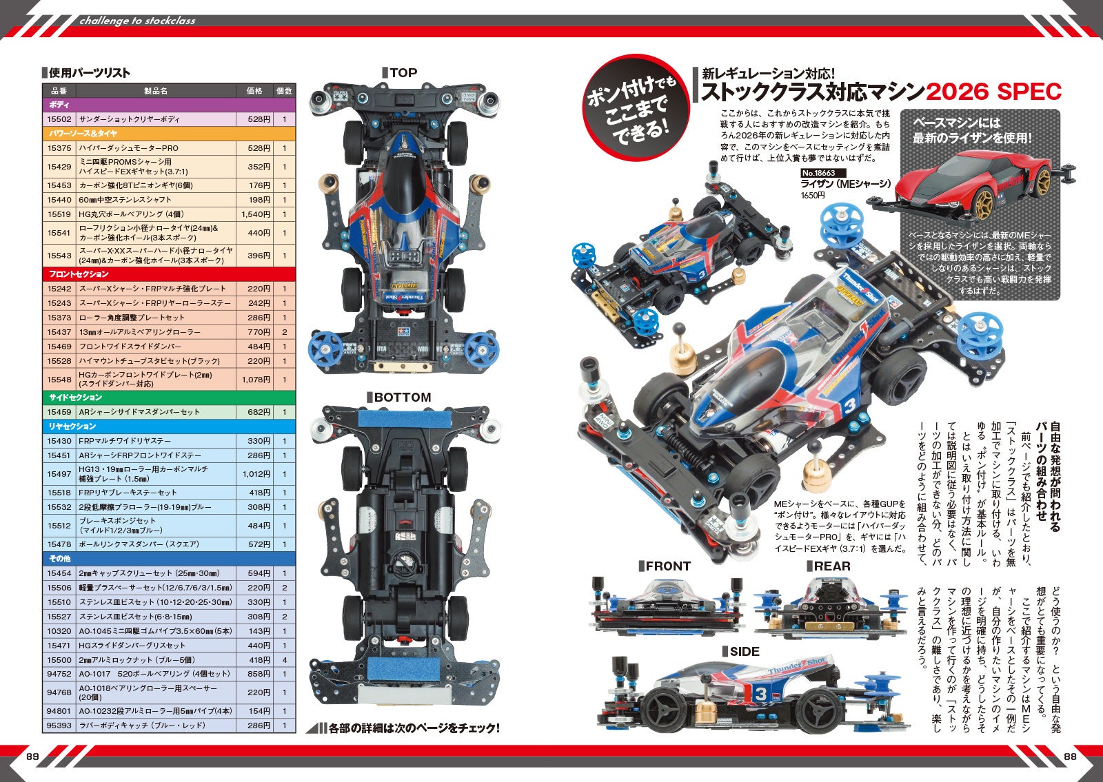 ボディやパーツの加工なしで、初心者でもレースを楽しめると盛り上がっている「ストッククラス」。新たに登場したMEシャーシをベースに、グレードアップパーツを取り付けレースで勝利を目指す改造のポイントを紹介します。