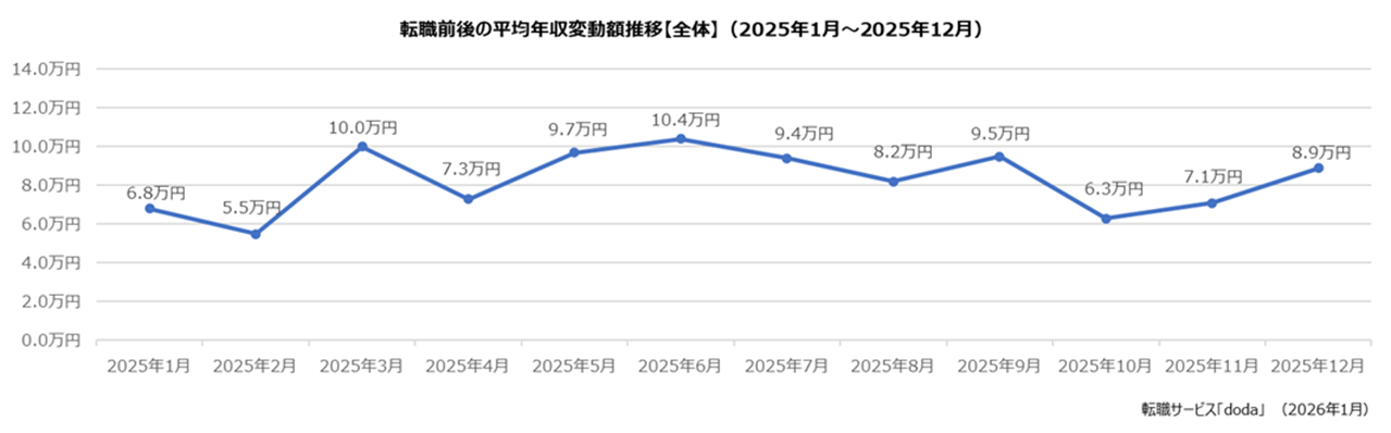 パーソルキャリア株式会社が運営する転職サービス「doda(デューダ)」(編集長:桜井 貴史)は、dodaエージェントサービスを利用して2025年12月に転職決定した個人の、転職前後の平均年収変動額と年収変動割合を発表いたします。