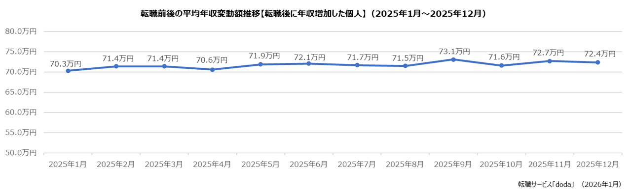 転職後に「年収増加」した個人の年収は、平均で72.4万円(前月差:-0.3万円)増加しました。