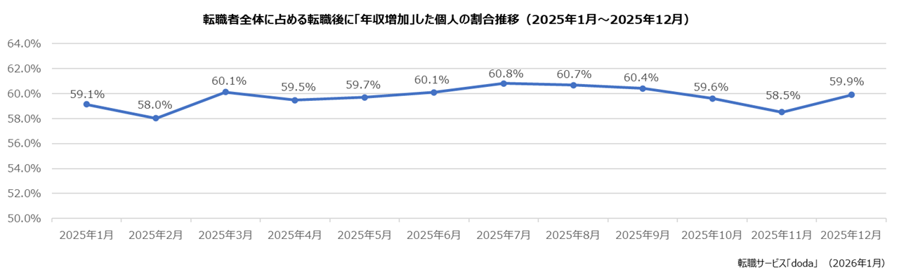 転職者全体に占める転職後に年収増加した個人の割合:59.9 %(前月差:+1.4ポイント)