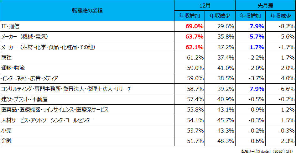 転職後に年収増加した個人が多かった業種は、「IT・通信」(69.0%)、次いで「メーカー(機械・電気)」(63.7%)、そして「メーカー(素材・化学・食品・化粧品・その他)」(62.1%)が続きました。[画像4: https://prcdn.freetls.fastly.net/release_image/22215/978/22215-978-cf5e631a719cdc53ef0458306778a005-945x501.png?width=536&quality=85%2C75&format=jpeg&auto=webp&fit=bounds&bg-color=fff ]