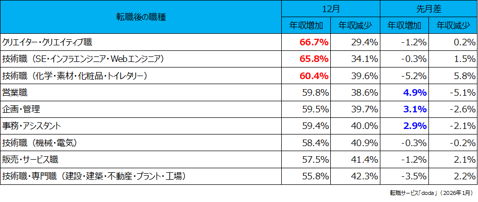 転職後に年収増加した個人が多かった職種は、「クリエイター・クリエイティブ職」(66.7%)、次いで「技術職(SE・インフラエンジニア・Webエンジニア)」(65.8%)、そして「技術職(化学・素材・化粧品・トイレタリー)」(60.4%)が続きました。[画像5: https://prcdn.freetls.fastly.net/release_image/22215/978/22215-978-dc967415c17026ea6a9a49c8724e4611-945x401.png?width=536&quality=85%2C75&format=jpeg&auto=webp&fit=bounds&bg-color=fff ]