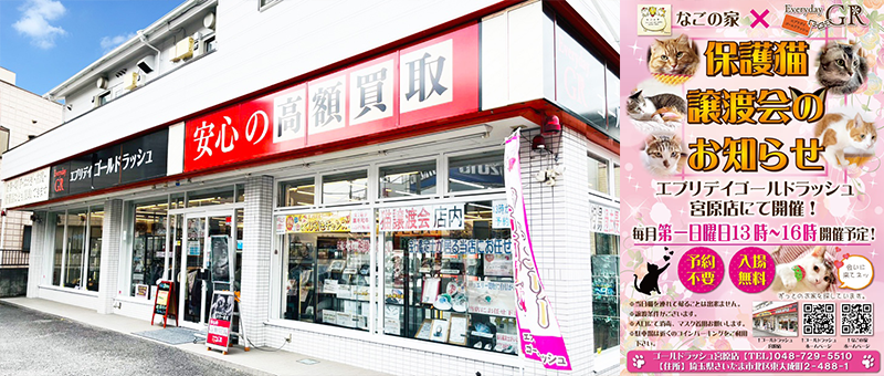 2021年2月27日、エブリデイゴールドラッシュ宮原店で初の保護猫譲渡会が行われました。背景には、コロナ禍による販売形態の変更で生まれた「店舗内の空きスペース」がありました。感染対策を徹底しながら、「地域交流」や「誰かの助けになる場」として、このスペース を活かせないかと模索する中で、保護猫の譲渡会を行っているなごの家とのご縁が繋がりました。【ものを繋ぐ】と【命を繋ぐ】リユースショップとして今後も地域貢献・密着で行っていきたいと思いこの企画を今まで続けてきました。[画像3: https://prcdn.freetls.fastly.net/release_image/24989/222/24989-222-2aafb0ff9139a6b1b8d906ab29f59a45-800x340.png?width=536&quality=85%2C75&format=jpeg&auto=webp&fit=bounds&bg-color=fff ]