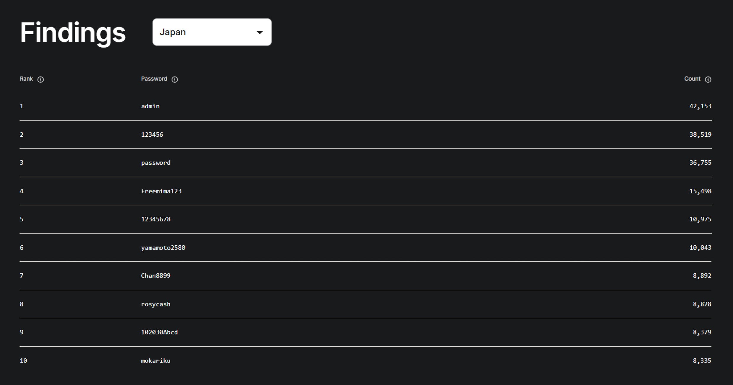 6位には「yamamoto2580」がランクインしました。「自分の名前+数字」の組み合わせは、SNS等の公開情報と照合されやすく、日本国内のユーザーにとってリスクが高いことが改めて確認されました。ハッカーは、日本人の氏名リストや日本の文化・言語に特化した辞書を用いてパスワードの組み合わせを生成することが可能であり、こうした傾向は不正アクセスのリスクを高める要因となります。