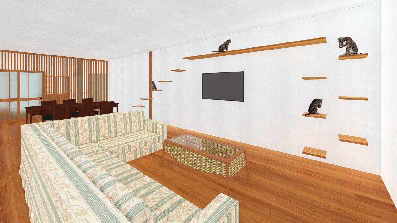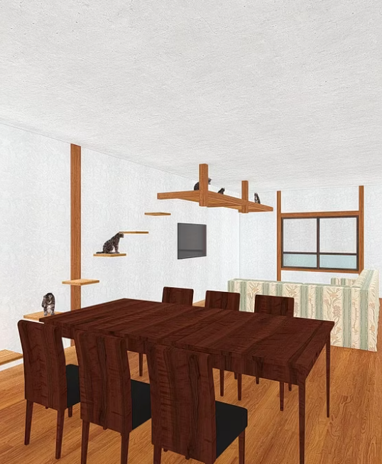 木の温もりを感じるリビングダイニングには、猫たちがのびのびと過ごせるよう、壁一面にキャットウォークやキャットステップを設置。人間にとっても猫にとっても快適で、洗練された空間デザインとなっています。