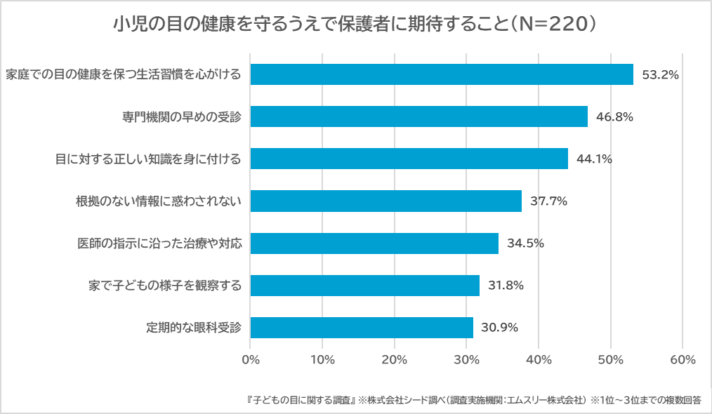 また、眼科医に対して「小児の目の健康を守るうえで保護者に期待すること」を質問したところ、「家庭での目の健康を保つ生活習慣を心がける」(53.2%)、「専門機関の早めの受診」(46.8%)、「目に対する正しい知識を身に付ける」(44.1%)といった項目が上位に挙がりました。