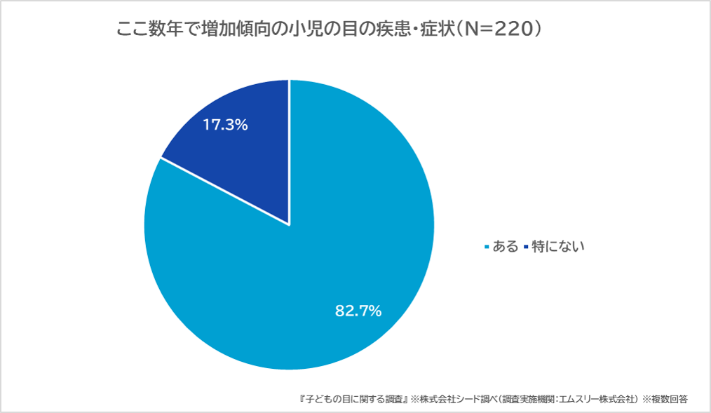 注目すべきは「ここ数年で増加傾向にあると感じる、何らかの小児の目の疾患・症状があるか」という質問に対し、眼科医の82.7%が「ある」と回答し、医療現場でも子どもの目に関する相談が増えている実態が明らかになったことです。