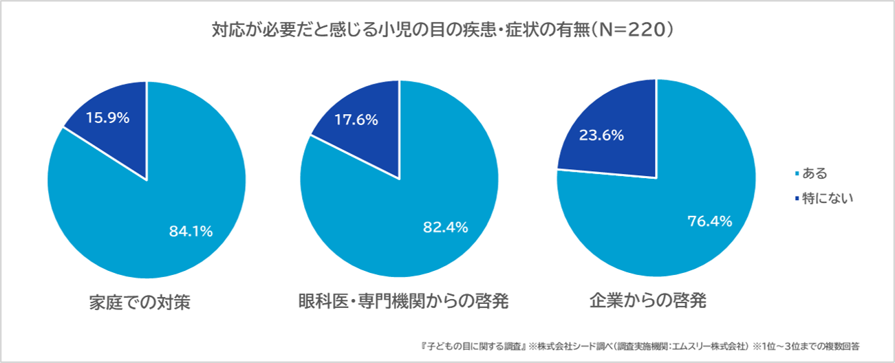 眼科医に「家庭、眼科医・専門機関、企業それぞれにおいて対応が必要と感じる小児の目の疾患・症状があるか」質問したところ、「家庭での対策」は84.1%、「眼科医・専門機関からの啓発」は82.4%、「企業からの啓発」は76.4%があると回答しました。