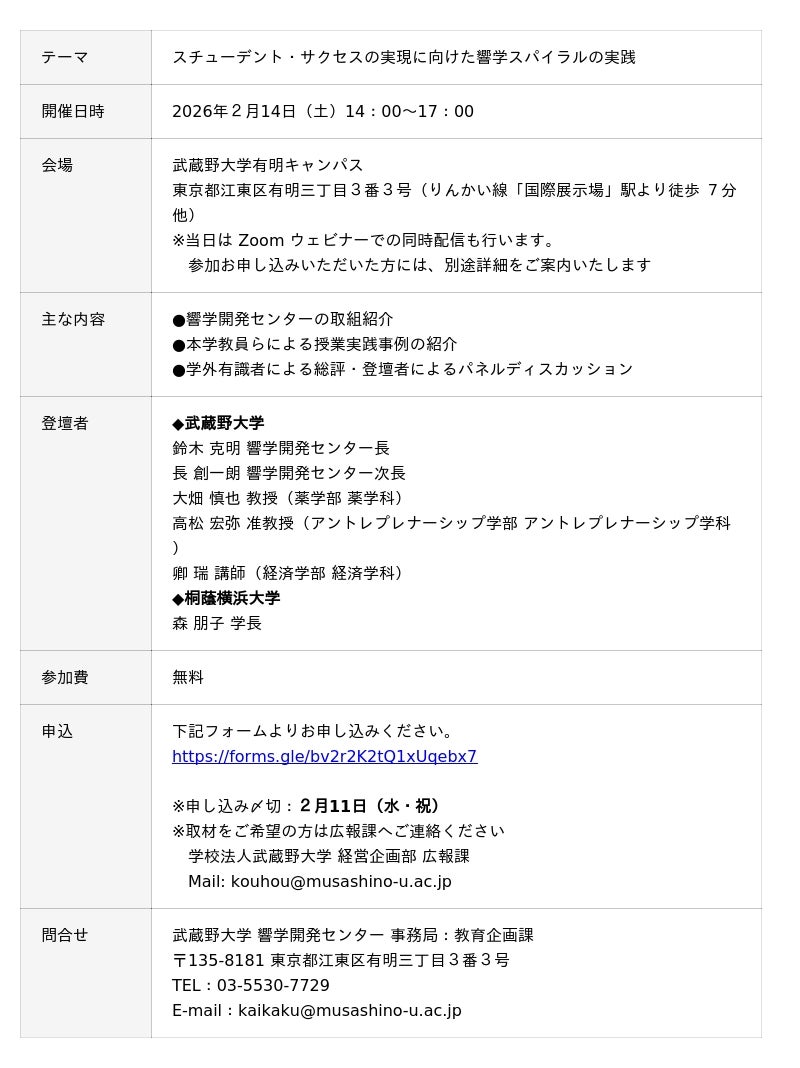 武蔵野大学響学開発センター(所長:鈴木 克明)は2月14日(土)に武蔵野大学有明キャンパスでシンポジウム『スチューデント・サクセスの実現に向けた響学スパイラルの実践』を開催します。