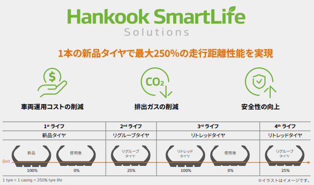 また、環境への配慮のため、ハンコック「SmartLifeソリューション」として、リグルーブおよびリトレッド可能な設計を採用し、タイヤの長期使用と再利用を促進することで、資源使用量の削減や環境負荷低減を実現します。