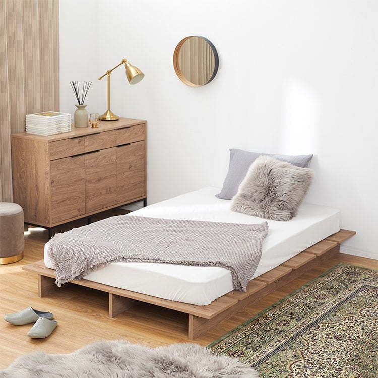 両サイドにしっかり余白があり、スマホや充電器、アクセサリーなどの小物をまとめて置けるのが便利。ローベッドタイプなので空間に圧迫感が出にくく、インテリアにも自然になじむシンプルさも気に入っています。