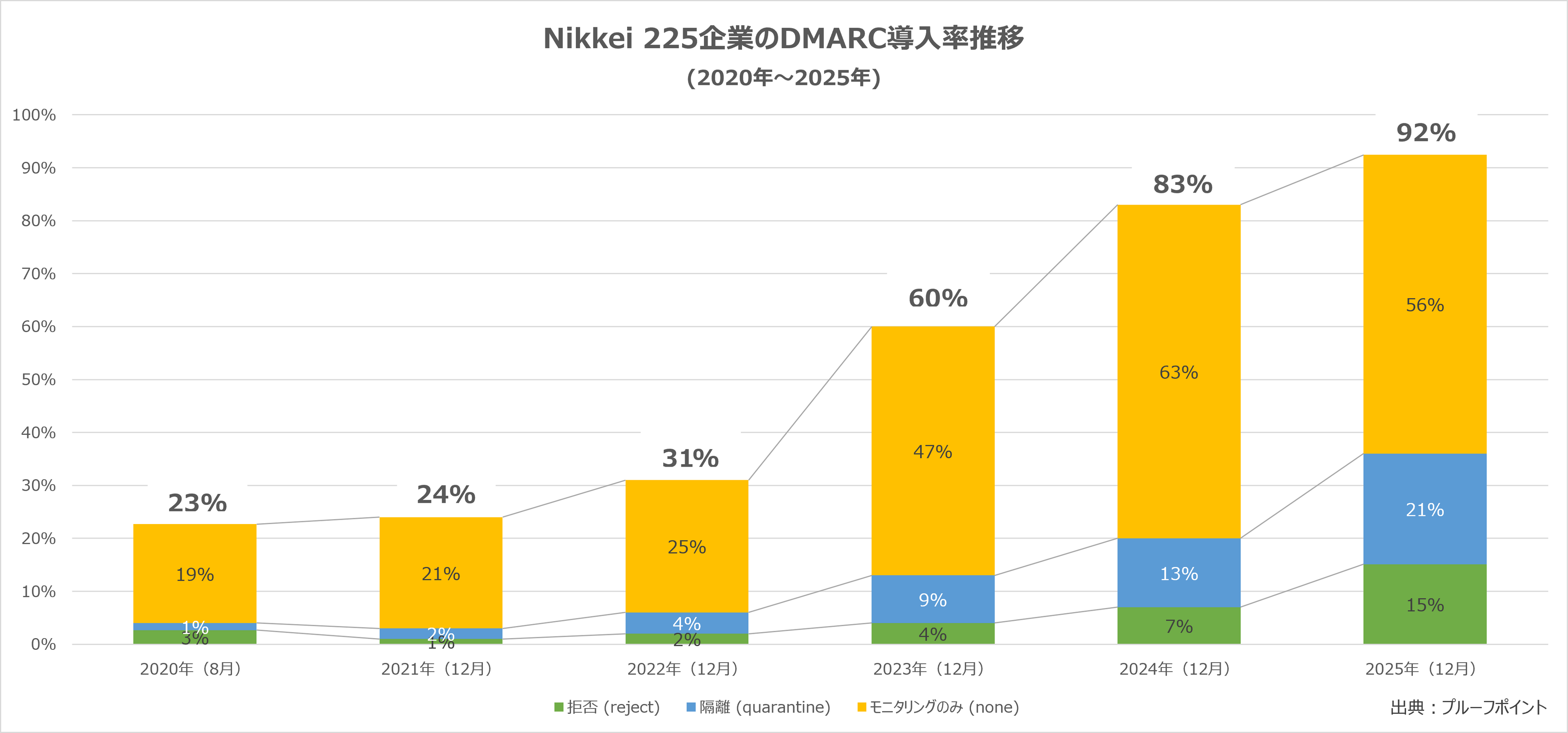 - 推奨される最高レベルのDMARC認証(Reject)を導入している日経225企業は、昨年の7%から倍増したものの、わずか15%にとどまっている。