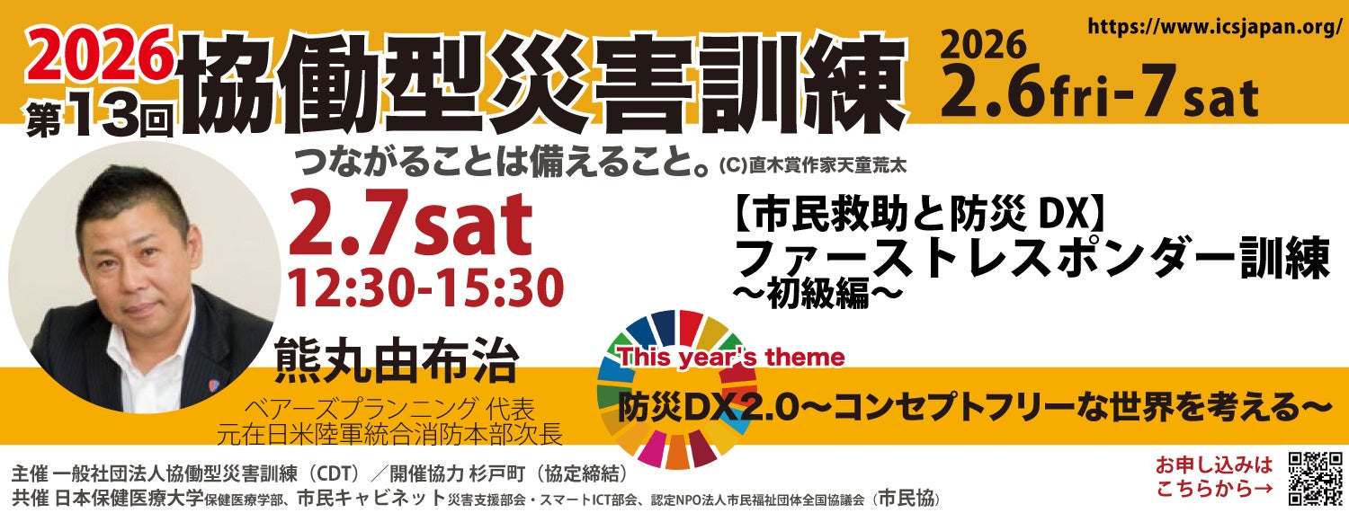 2014年国土交通省「広域的地域間共助推進事業」としてスタートし、「これまでの震災の経験と教訓を、来るべき大規模災害に活かすこと」をモットーに毎年開催を重ねている一般社団法人協働型災害訓練(本社:埼玉県東松山市、代表理事:とよしま亮介)は、2026年2月6日(金)・7日(土)に開催される「第13回協働型災害訓練in杉戸」において、元在日米陸軍 熊丸由布治氏による「ファーストレスポンダー訓練(初級編)」を実施いたします。