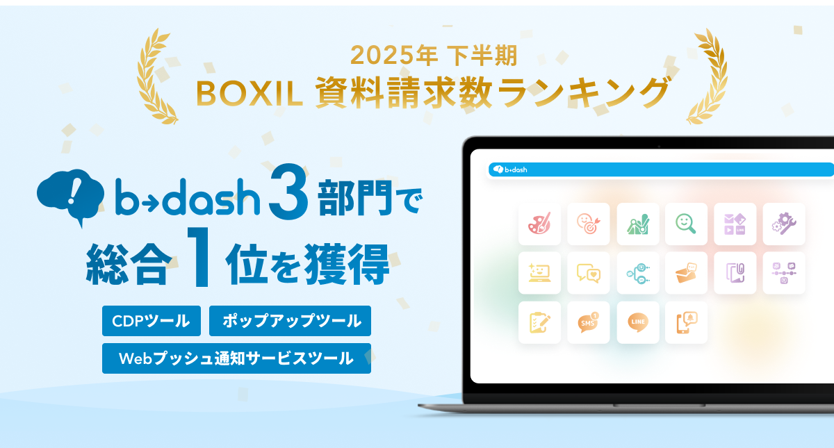 株式会社データX(本社:東京都新宿区、代表取締役社長:安部泰洋)が提供するデータマーケティングクラウドシステム「b→dash」は、スマートキャンプ株式会社(以下「スマートキャンプ」)が発表する「2025年下半期 BOXIL資料請求数ランキング」において、「CDPツール」「ポップアップツール」「Webプッシュ通知サービス」の3つのカテゴリで総合1位を受賞したことをお知らせいたします。今回、b→dashが受賞した上記3カテゴリの総合1位は、該当カテゴリにおいて、対象期間内(2025年7月1日~2025年12月31日)にユーザーからの資料請求数が最も多かったサービスとして選出されました。