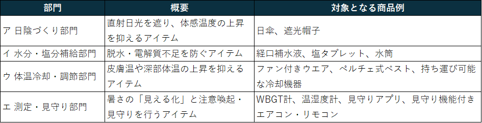 令和8年4月1日時点で一般ユーザーが購入又は利用することができる、個人が身につける又は持ち運ぶことができる、熱中症対策に資する物品又はサービスを対象とします。ただし、測定・見守り部門に限り、エアコンなどの設置型家電についても対象とします。