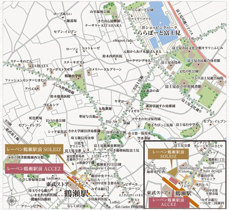 本プロジェクトは、東武東上線「鶴瀬」駅から徒歩1分の「レーベン鶴瀬駅前 ACCEZ(全32邸)」と、徒歩2分の「レーベン鶴瀬駅前 SOLEIZ(全48邸)」からなるツインフラッグプロジェクトです。
