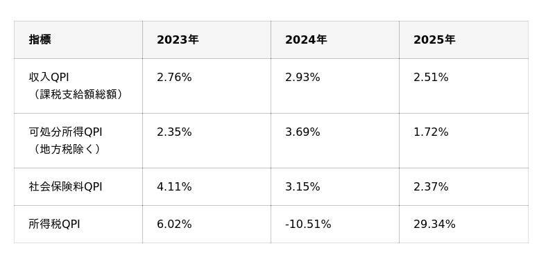 収入QPIに関しては、2023年から2025年にかけて年あたり2.5%から3%程度の水準で増加しており、継続的な賃上げの動きが表れています。それに対して、可処分所得QPI及び所得税QPIは大きく変動しており、2024年に実施された定額減税の影響を強く受けた結果とみられます。これにより、手取りの増加を実感しにくい状況が見受けられます。一方で、社会保険料QPIを見ると、2023年から増加幅が減少しており、標準報酬月額の上限到達の影響が考えられます。
