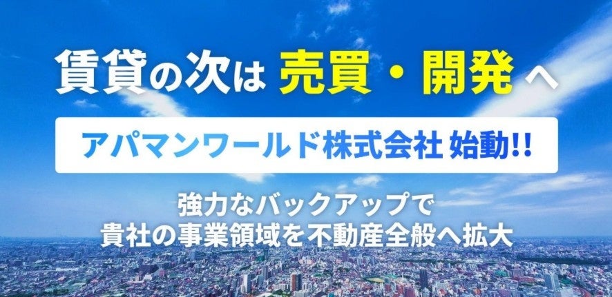 APAMAN株式会社(東京都中央区、代表取締役社長:山崎戒)は、株式会社ワールドホールディングス(福岡県福岡市、代表取締役会長兼社長:伊井田栄吉)との合弁により、アパマンショップ加盟企業の事業多角化を支援する新会社「アパマンワールド株式会社」を設立いたしましたのでお知らせいたします。