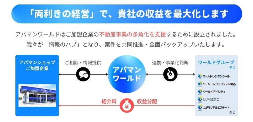 APAMANグループの全国ネットワークと、ワールドホールディングスが有する高度なデベロップメント機能を融合。アパマンショップの加盟店企業が、現在の「賃貸仲介・賃貸管理」という強固な事業基盤を維持しつつ、不動産売買、建築、再開発、事業承継といった「新たな成長領域」へも同時に進出できるよう、新会社が情報のハブとなり総合的な支援体制を構築いたします。両社の融合により、一社では成し得ない圧倒的な事業成果の創出を追求してまいります。