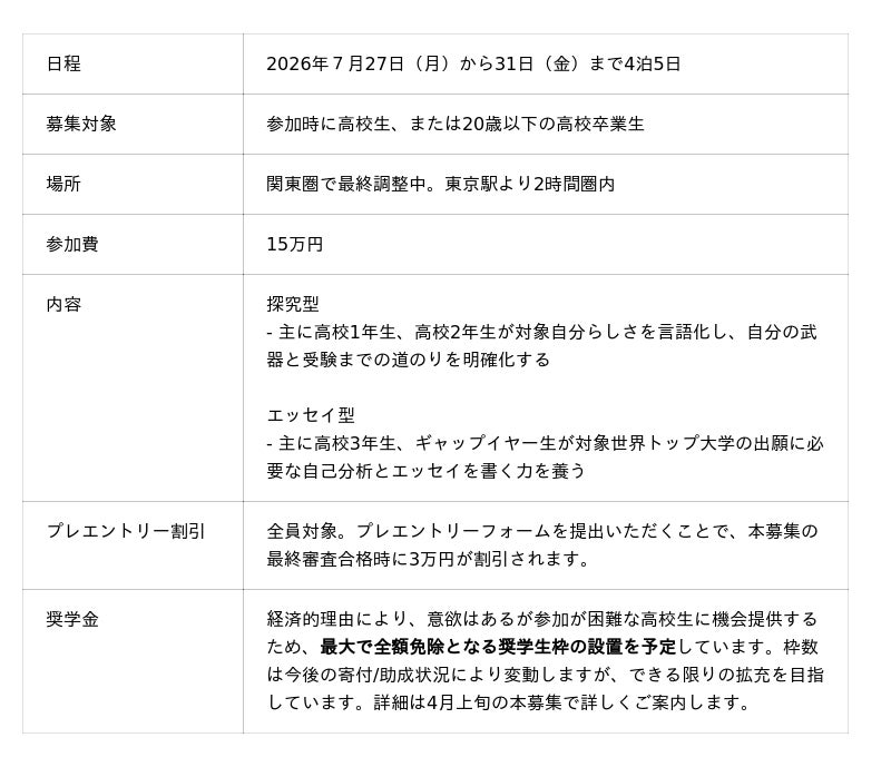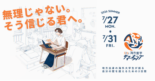 一般社団法人52Hz(本社:京都府、代表理事:梅澤凌我、以下52Hz)は、2026年7月27日(月)から31日(金)までの5日間「52Hz海外進学サマーキャンプ2026」を開催します。