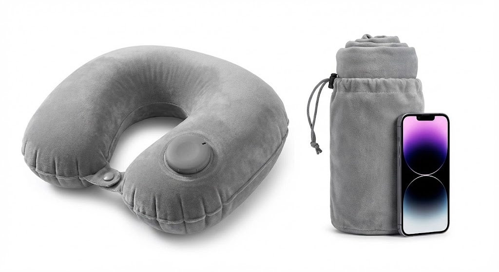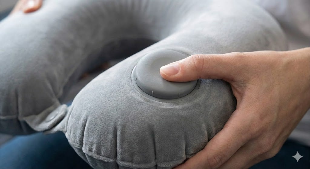 1. 【衛生的&スマート】指で押すだけ!口をつけずに30秒で完成 本体に内蔵された大きな「丸型ポンプ」を指でプッシュするだけで、みるみる空気が入ります。 口を一切つける必要がないため、非常に衛生的。空港のロビーや機内でも、人目を気にせずスマートに準備が整います。