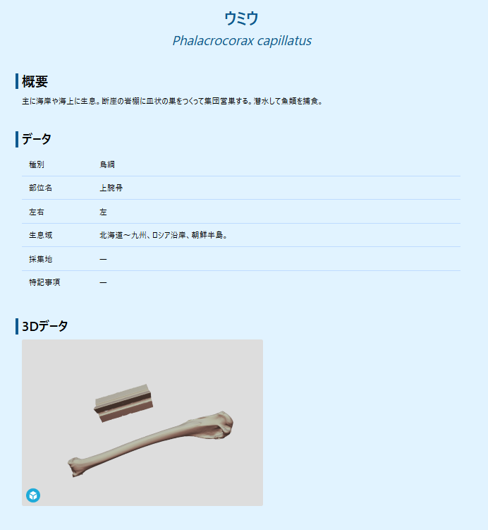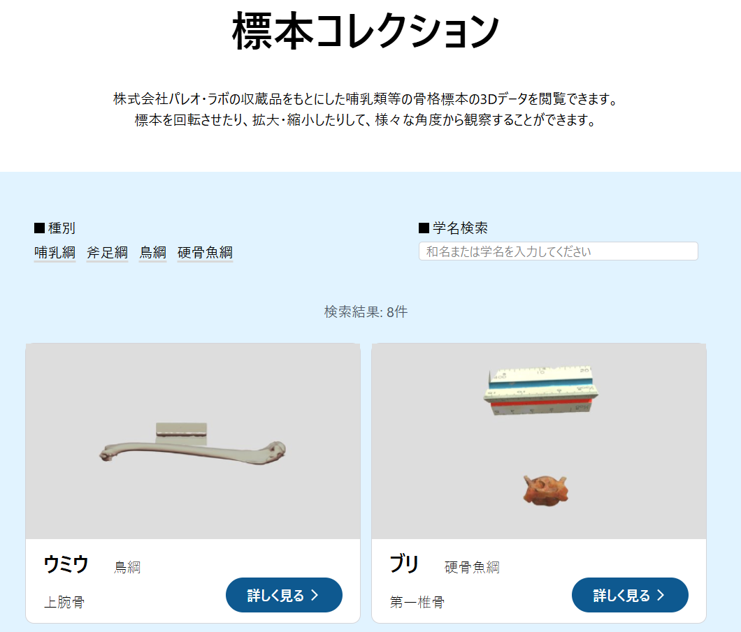 本サイトでは、3Dモデルの閲覧に加え、標本に関する情報もあわせて確認できる設計としています。