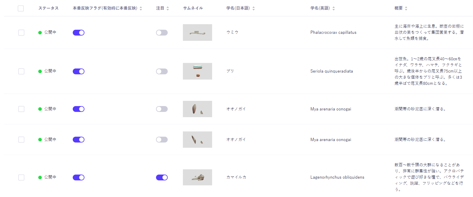 分類ごとに標本を表示できる構成とし、和名および学術名でのキーワード検索を設けるなど、利用者が目的の標本にアクセスしやすい導線を整備しています。
